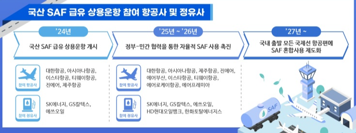 - 2024년 8월 30일부터 국내 공항에서 우리나라 항공사가 국제민간항공기구(ICAO)가 인증한 국산 SAF를 급유해 국제선 정기운항을 실시했습니다.