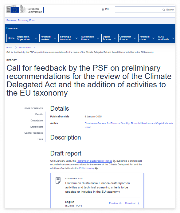 - 기후 위임법 검토 및 EU 분류 체계에 활동 추가를 위한 예비 권고 사항에 대한 PSF의 피드백 요청