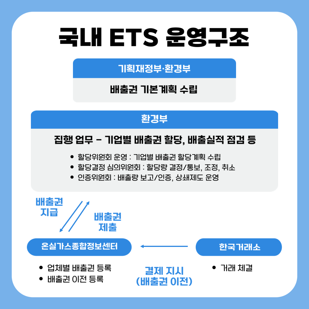 국내 ETS는 기획재정부와 환경부과 주관하고 있습니다. 가장 먼저, 기획재정부와 환경부는 배출권 기본계획을 수립합니다. 수립된 계획을 바탕으로 환경부가 집행 업무를 수행합니다.